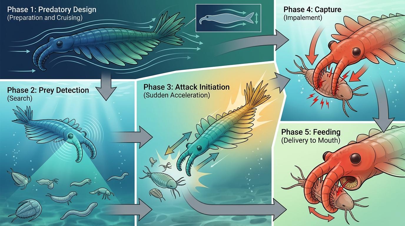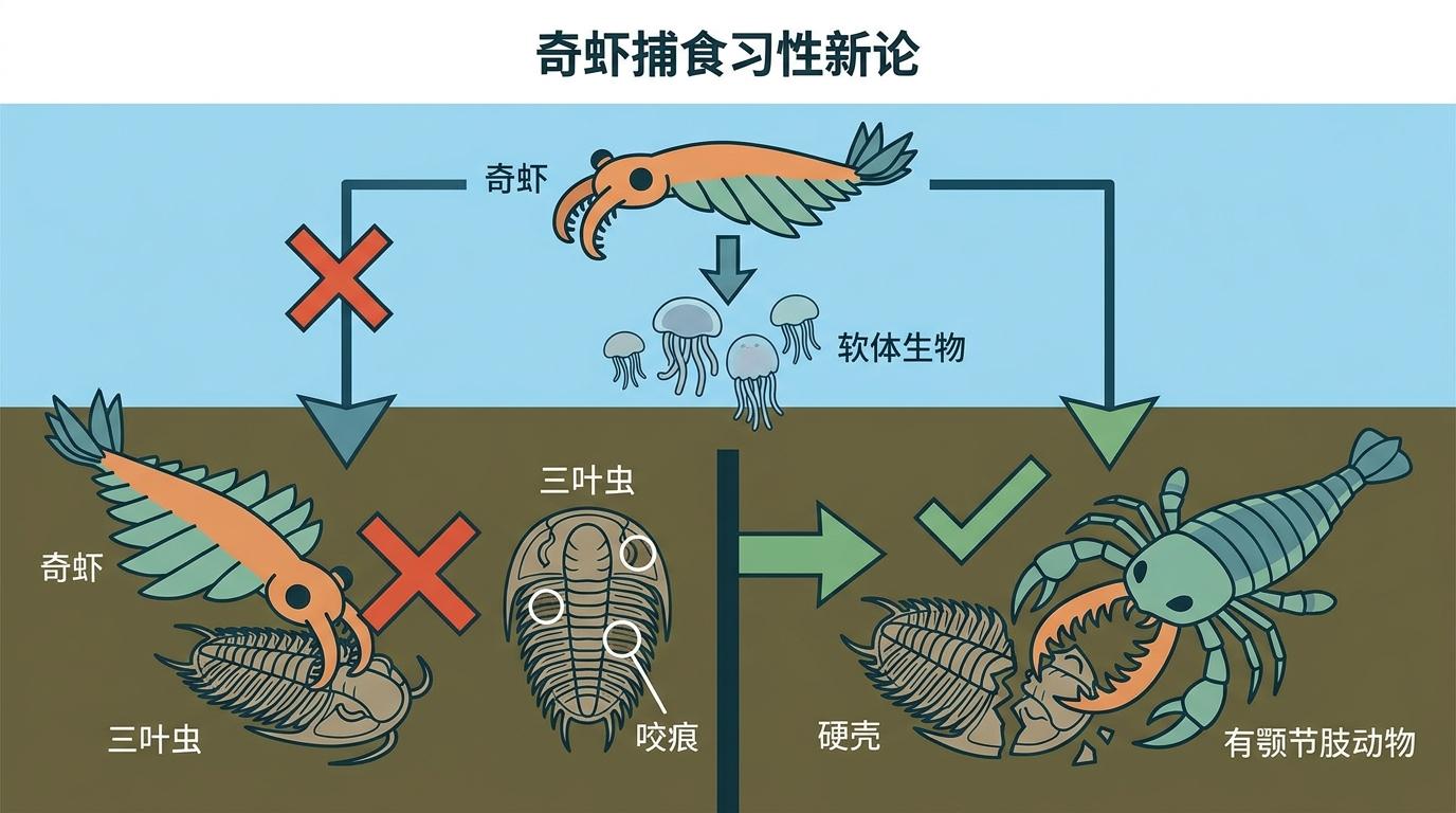 这个结论直接洗清了奇虾的“嫌疑”:那些带有咬痕的三叶虫化石,凶手另有其人——可能是具备咀嚼硬壳能力的有颚类节肢动物。而奇虾的生态位,也从“底栖硬壳猎物捕食者”转向了“中上层水体软体猎手”。