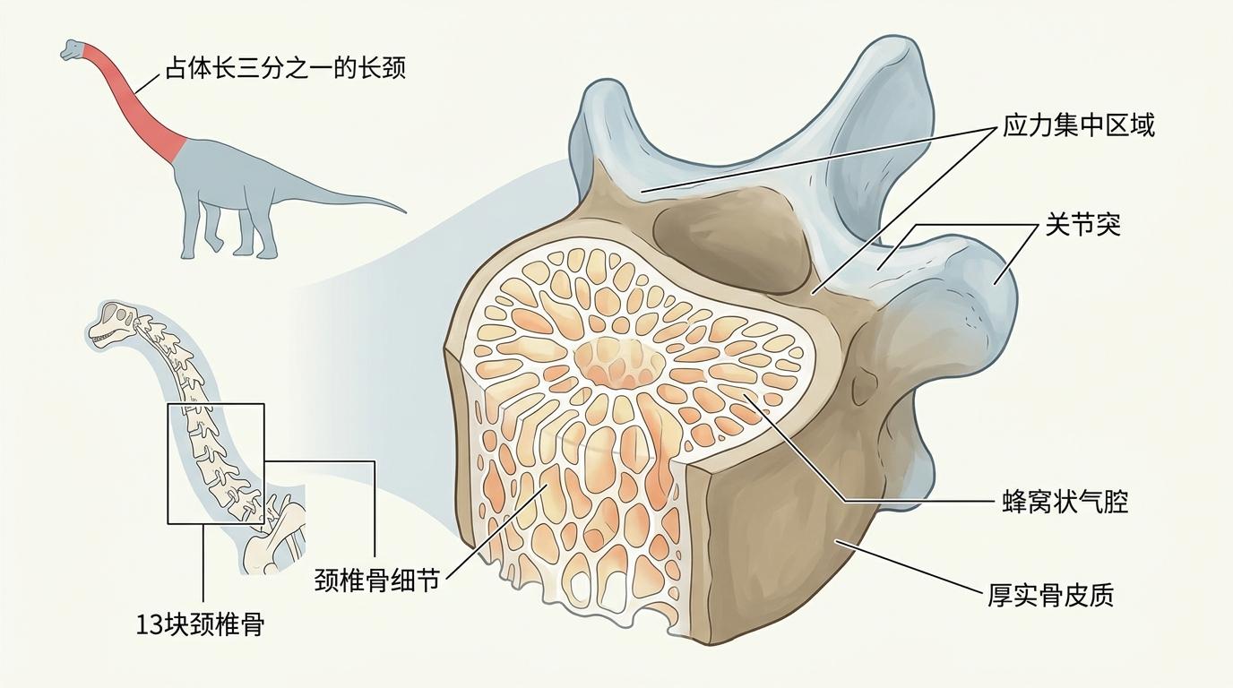 答案藏在它那根占体长三分之一的长颈里。腕龙的颈部由13块颈椎骨构成,每块骨头内部都布满了蜂窝状的气腔,这是它能支撑9米长脖子的关键——这些气腔能把骨骼重量减轻50%以上,却又在应力集中的外层保留厚实骨皮质,完美平衡了轻便与强度。就像工程师在桥梁内部留空减重,同时加固承重钢梁,腕龙的颈椎是进化打磨出的轻量化奇迹。