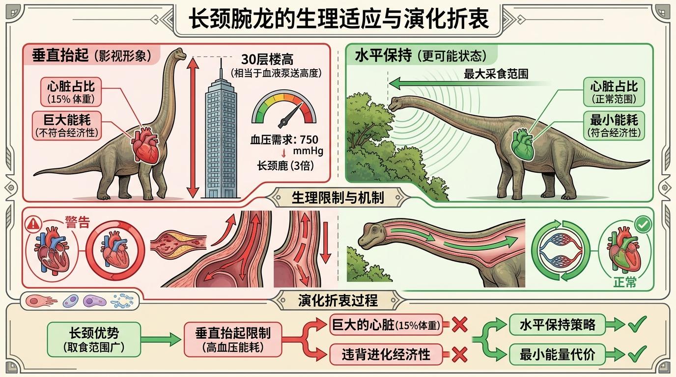 但这根长颈也给它套上了生理枷锁。古生物学家测算,若腕龙像影视里那样把脖子竖直抬起,心脏需要产生750毫米汞柱的血压——这是长颈鹿的3倍,相当于把血液泵到30层楼高。如此巨大的能耗,会让它的心脏占体重比例达到恐怖的15%,完全违背生物进化的经济性。更可能的是,它的脖子大多保持水平,仅在需要时小幅抬起,用最小的能量代价覆盖最大的采食范围。