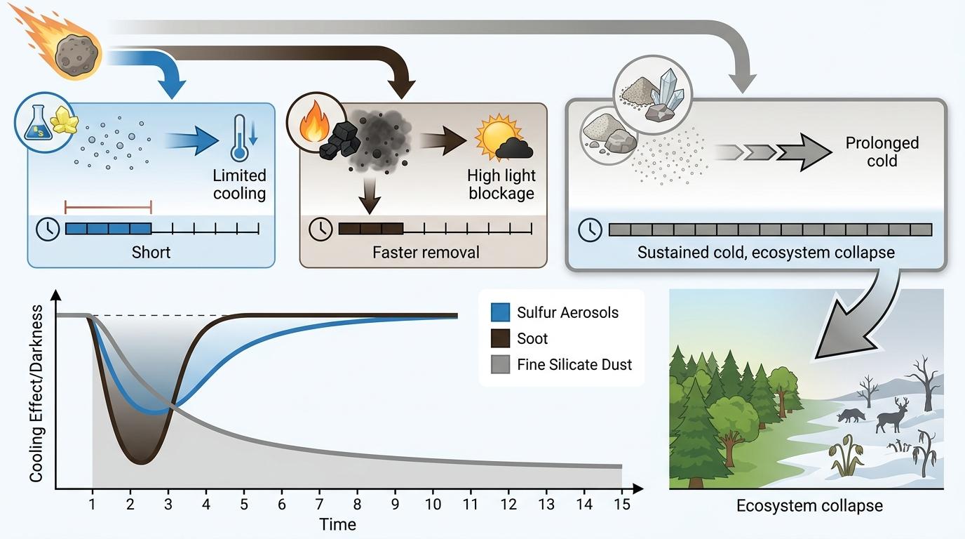 过去的模型一直把硫气溶胶和烟尘当成撞击冬天的主要驱动力,但新研究显示:硫气溶胶只能让地球降温10°C,且持续时间不超过5年;烟尘的遮光度虽强,但3年左右就会沉降。只有这些细硅酸盐尘埃,能制造长达15年的持续寒冷,而这恰好和化石记录中生态系统崩溃的时间线完全吻合。