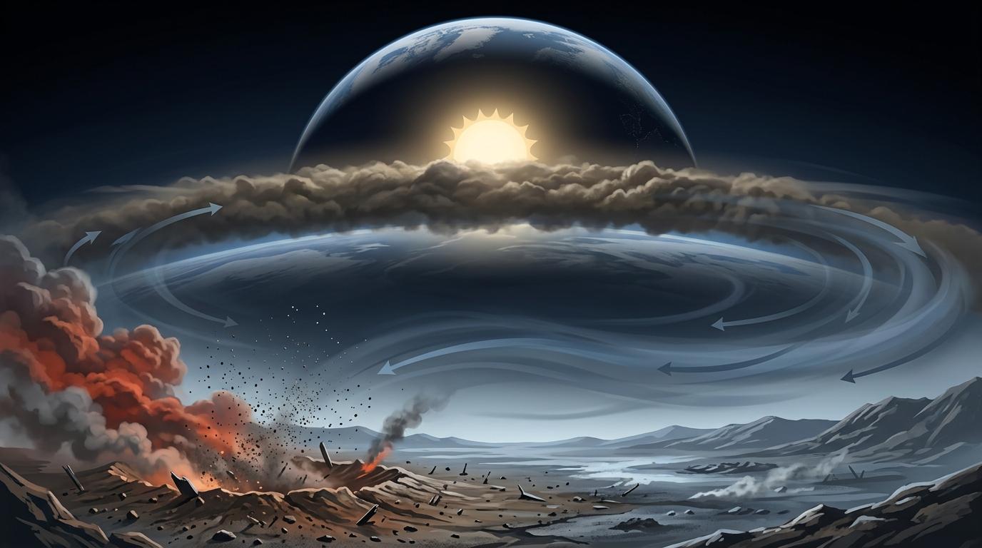 这意味着,撞击发生后数小时内,这些微米级尘埃就随着冲击波被抛射到平流层,随后在大气环流的带动下,只用了几天就环绕整个地球。它们像一层永不消散的乌云,把太阳彻底挡在外面。