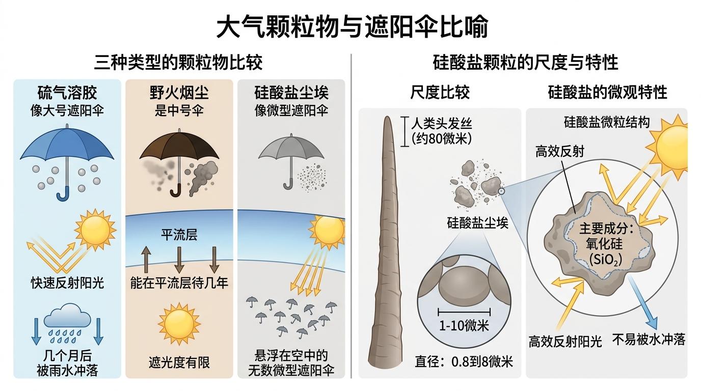 你可以把大气中的颗粒物想象成不同大小的遮阳伞:硫气溶胶像大号遮阳伞,能快速反射阳光,但几个月就会被雨水冲落;野火烟尘是中号伞,能在平流层待几年,但遮光度有限。而这次研究盯上的,是直径0.8到8微米的硅酸盐尘埃——比人类头发丝细10到100倍,像无数把悬浮在空中的微型遮阳伞。