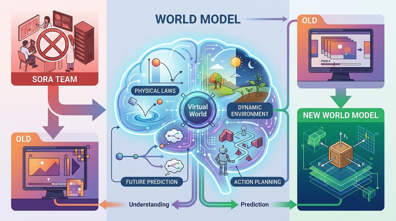 关停之后,SORA团队并未解散,而是转向了“世界模型”的研究——这是一种能理解物理世界因果规律、模拟环境动态变化的AI框架,简单说就是让AI在“大脑”里建一个虚拟世界,用来预测未来、规划行动。它不再是单纯生成视频像素,而是要掌握重力、碰撞、物体恒存这些真实世界的底层逻辑。