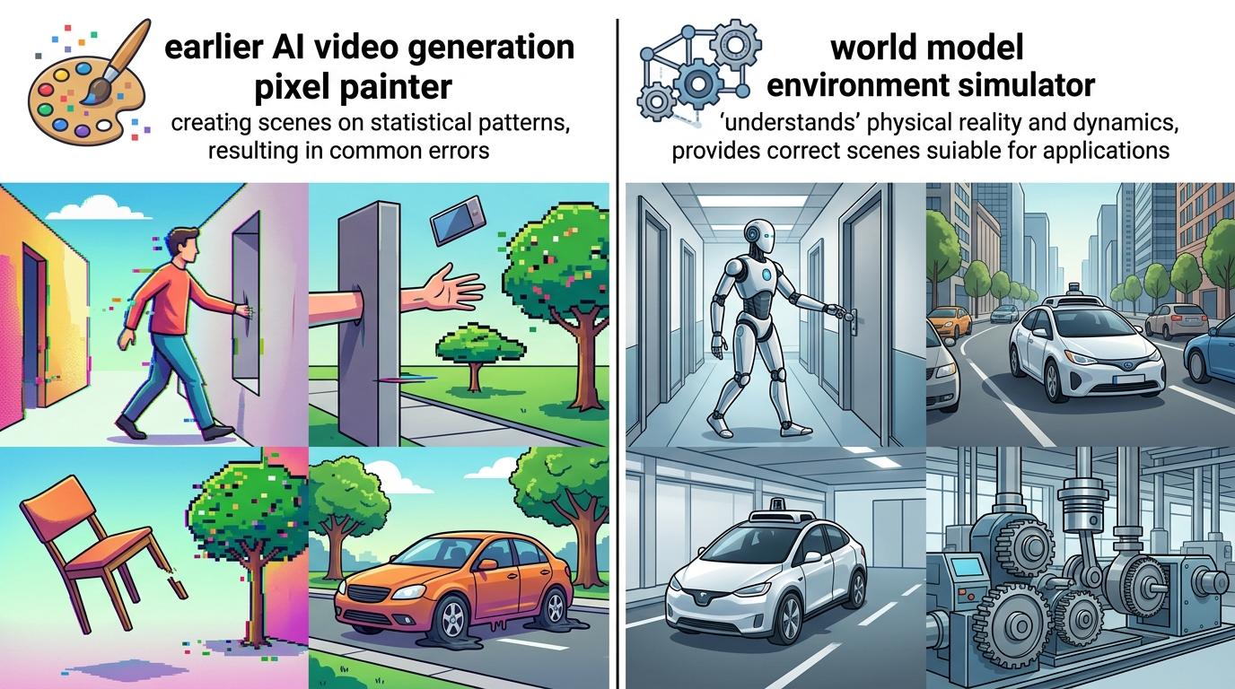 这其实是AI发展的必然方向:此前的视频大模型更像“像素画家”,只能根据统计规律生成画面,经常出现物体穿模、违背物理常识的错误;而世界模型是“环境模拟器”,能让AI真正“理解”世界,为机器人、自动驾驶、工业仿真提供核心支撑。