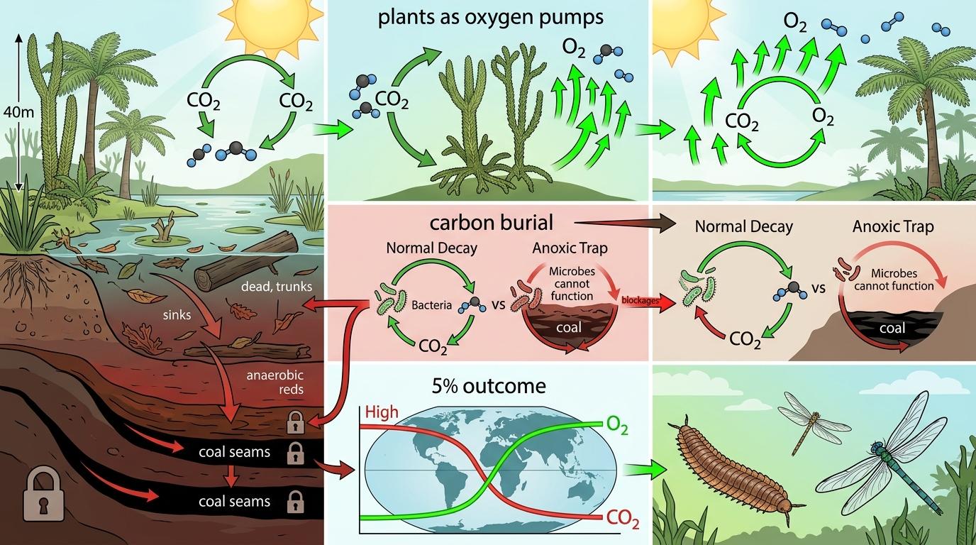 石炭纪的高氧不是凭空出现的——当时赤道附近的劳亚大陆被连绵的热带湿地森林覆盖,石松类、蕨类植物疯狂生长,最高能长到40米。这些植物像无数台“氧气泵”,每天吸收二氧化碳释放氧气,更关键的是,死亡的植物会沉入无氧沼泽,无法被微生物分解,最终形成煤炭,把碳牢牢锁在地下。这一过程让大气二氧化碳浓度骤降,氧气占比飙升至35%。