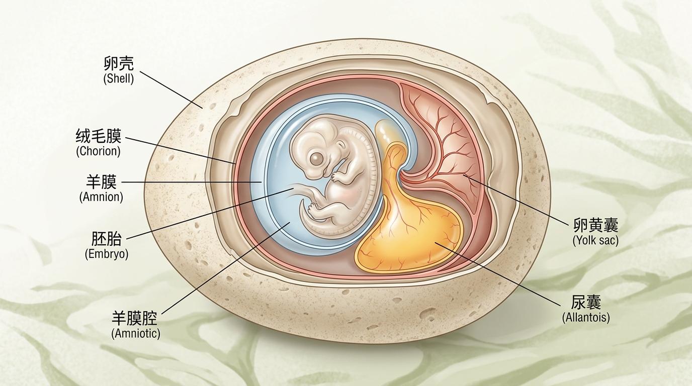 在石炭纪之前,两栖动物是陆地的主宰,但它们必须回到水里产卵,离不开湿润环境。而爬行动物进化出了羊膜卵:这种卵外层有坚硬的卵壳,内部有羊膜、尿囊等结构,能为胚胎提供独立的水环境,完全不需要依赖水体。