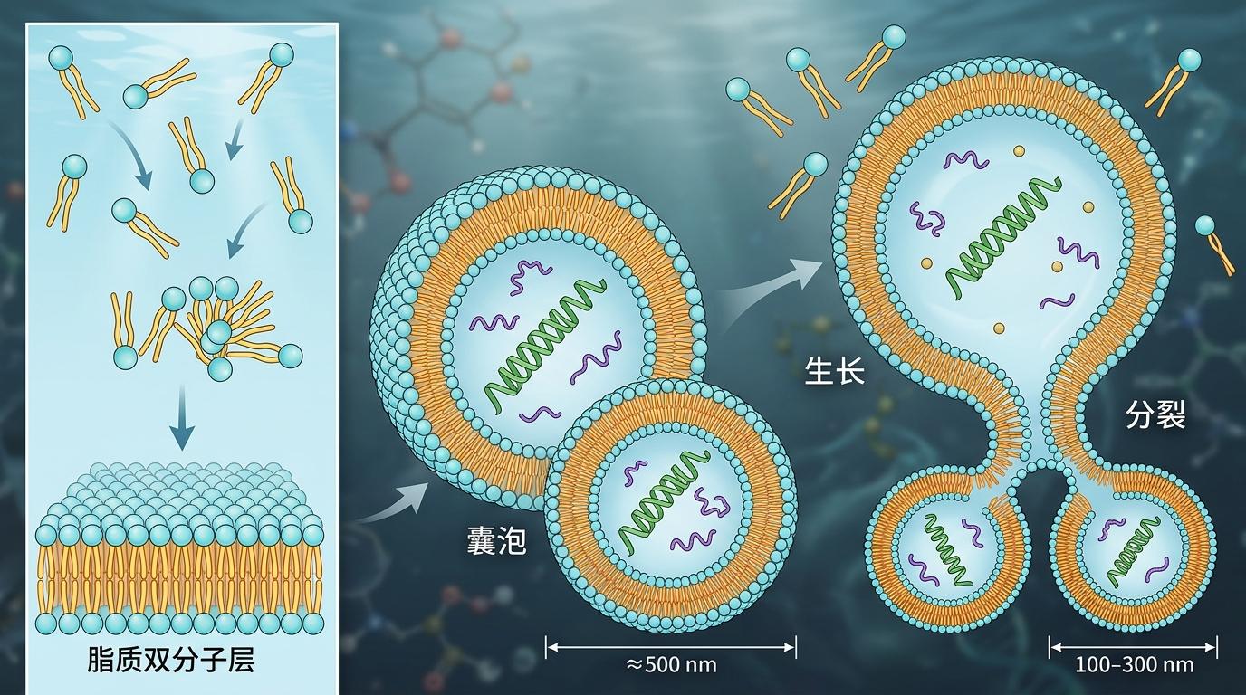 但RNA怎么和细胞膜结合,形成原始细胞?答案藏在脂质分子里。脂质分子有个奇怪的特性:亲水的头部喜欢水,疏水的尾部讨厌水。把它们扔进水里,会自发形成双层膜的囊泡——像一个微小的“塑料袋”,能把RNA和多肽包裹在里面。2009年,科学家把RNA放进人工合成的脂质囊泡里,发现这些囊泡会“长大”,然后分裂成两个小囊泡,里面的RNA也跟着被分到了新的囊泡里——这就是最原始的“细胞分裂”。