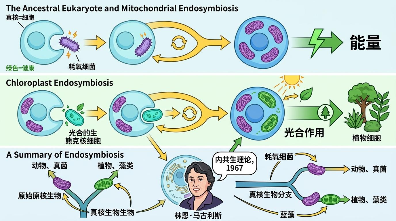 这个被吞噬的细菌在大细胞里活了下来,还学会了为宿主提供能量——它就是线粒体的祖先。后来,有些细胞又吞噬了能进行光合作用的蓝藻,这些蓝藻变成了叶绿体。这就是内共生理论,由生物学家林恩·马古利斯在1967年提出。