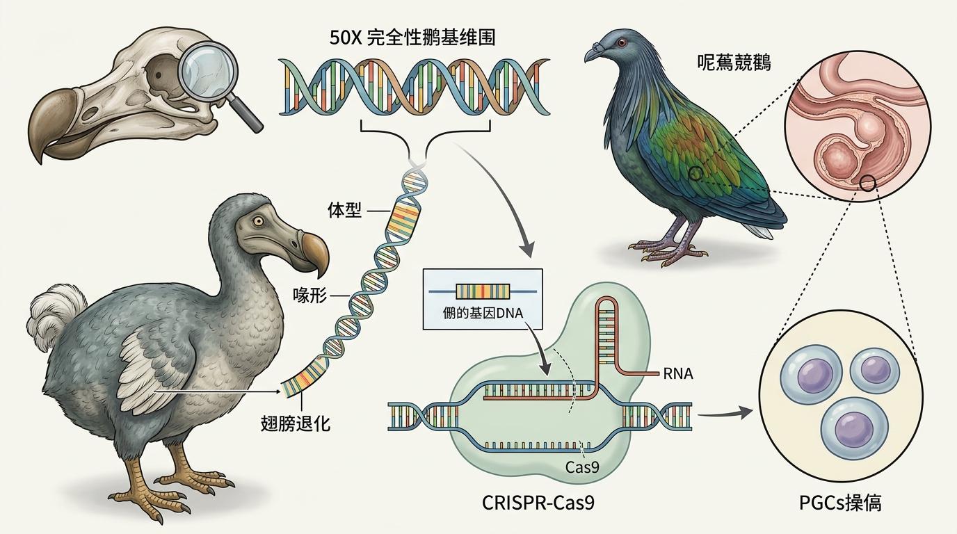2022年,丹麦自然历史博物馆的团队从渡渡鸟头骨中提取出完整度50X的基因组,这是复活计划的第一块拼图。他们找到渡渡鸟现存的近亲尼科巴鸠,打算用CRISPR基因编辑技术,把渡渡鸟的独特基因——比如控制体型、喙形和翅膀退化的片段——“写”进尼科巴鸠的原始生殖细胞。