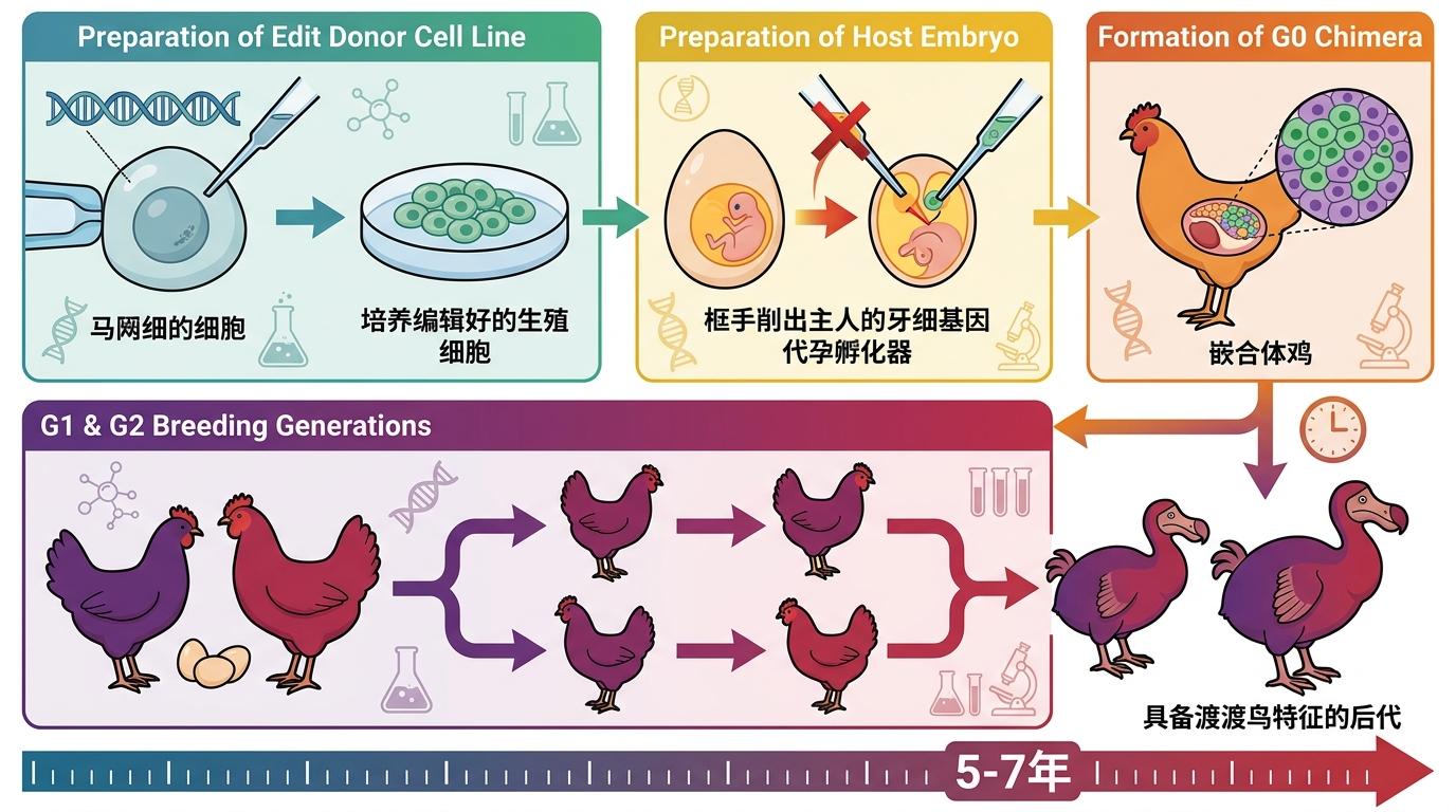 这不像给电脑装软件那么简单。鸟类没法用哺乳动物的克隆技术,只能先培养编辑好的生殖细胞,再植入基因改造过的鸡胚——这些鸡被敲除了自身生殖细胞基因,相当于“代孕孵化器”。要让嵌合体鸡长出带有渡渡鸟基因的生殖腺,再经过两代繁殖,才可能得到具备渡渡鸟特征的后代。整个流程,光是实验室阶段就要5到7年。