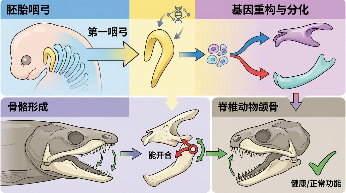 颌骨不是凭空出现的。它起源于脊椎动物胚胎时期的第一咽弓——也就是原本用来支撑鳃的那组软骨结构。通过基因调控网络的重构,原本的鳃弓软骨分化成了上颌的腭颞软骨和下颌的梅克尔软骨,再通过关节连接,形成了能开合的颌骨。