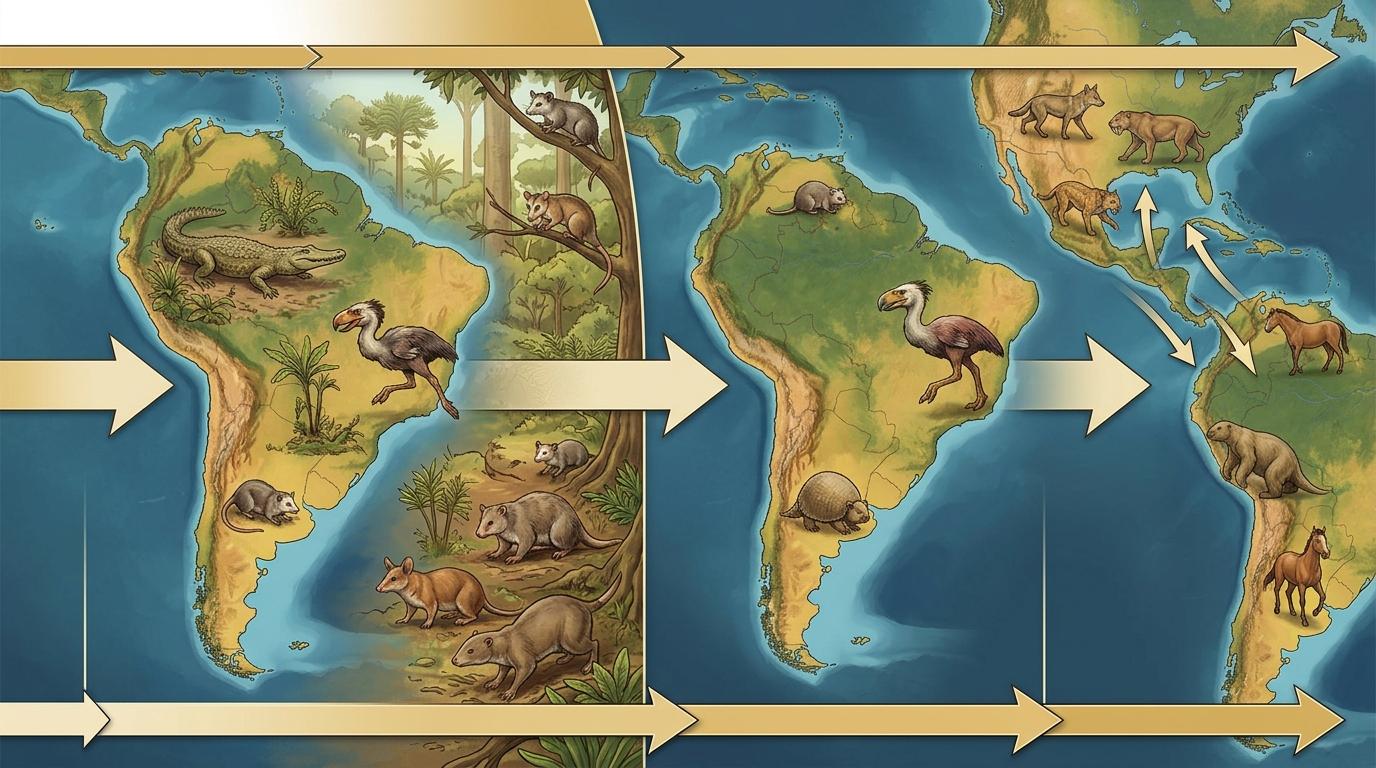 1.06亿年前,南美大陆因板块运动孤悬海外,在近1亿年的时间里演化出完全独立的生态系统——陆行鳄和窃鹤占据顶级掠食者位,有袋类是哺乳动物的主流。直到约280万年前,巴拿马陆桥彻底形成,这座连接南北美的狭长陆地,打破了南美亿万年的隔绝。