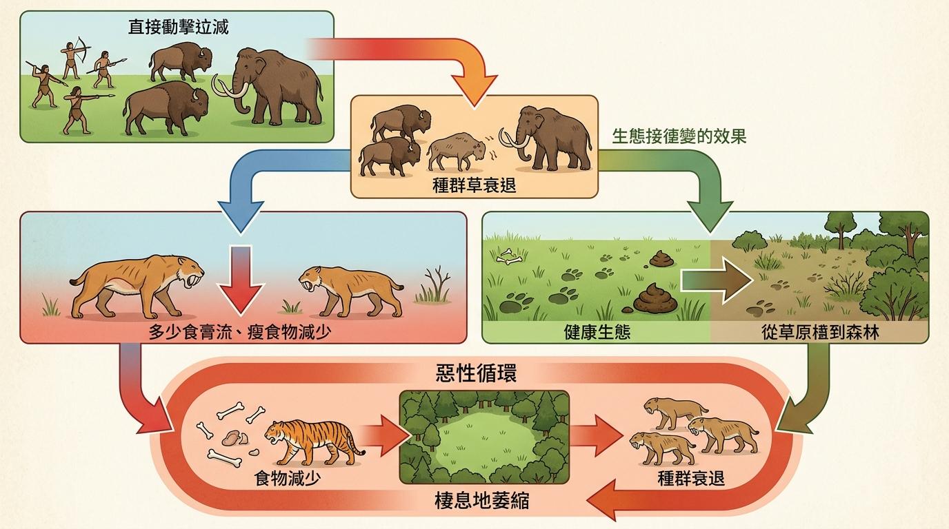 人类的捕猎直接压缩了毁灭刃齿虎的猎物资源,而更隐蔽的影响是生态系统的连锁反应:巨型草食动物的消失,导致草原缺乏踩踏和粪便滋养,进一步加速了草原向森林的转化,适合毁灭刃齿虎的栖息地持续缩小。此时的毁灭刃齿虎,已经陷入了“猎物减少-栖息地萎缩-种群衰退”的恶性循环。