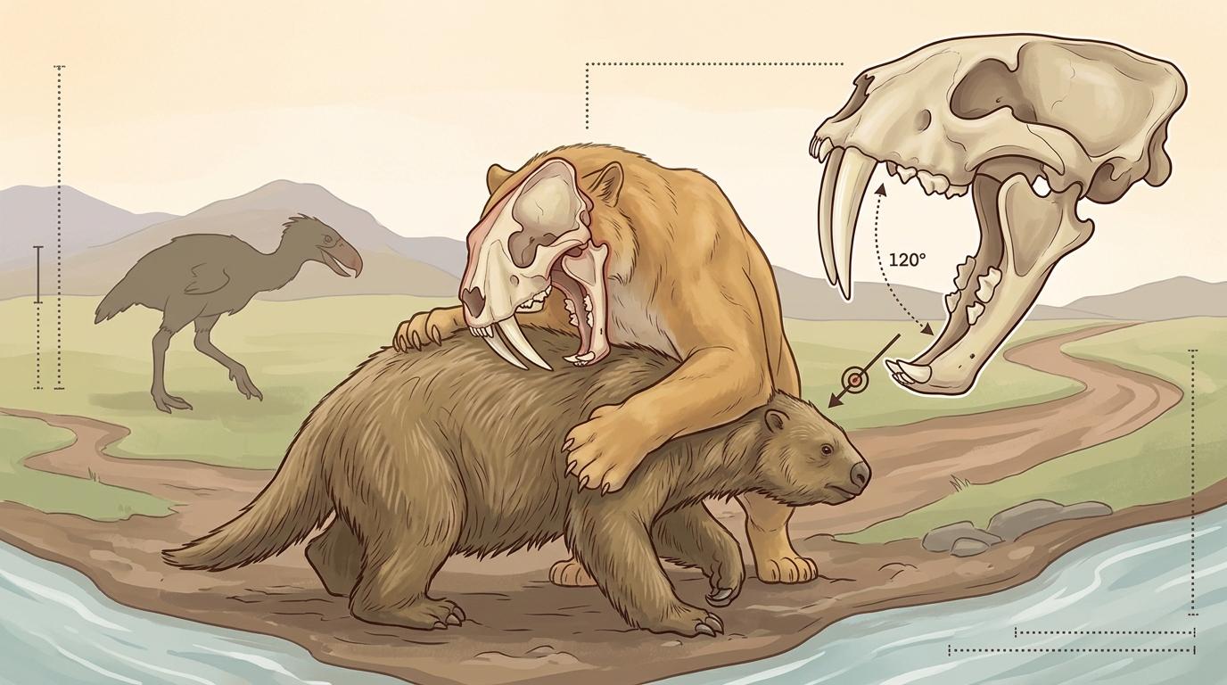 这并非简单的大陆连接,而是一场改写生态格局的“生物大交流”。北美物种凭借更高效的演化优势大举南下:刃齿虎追逐着巨型猎物进入南美,它们粗壮的前肢能牢牢按倒猎物,120°的夸张颚部张合度,配合匕首犬齿精准刺入咽喉,一击致命的效率远胜南美本土的窃鹤。不到百万年,窃鹤王朝崩塌,毁灭刃齿虎成为南美新的顶级掠食者,体型演化到剑齿虎家族的巅峰。