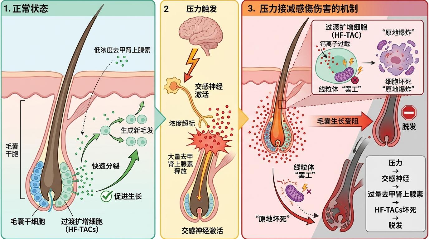 真相是:压力触发交感神经过度激活,会释放出大量去甲肾上腺素——这种平时促进毛囊生长的「营养液」,浓度一旦超标就会变成「毒药」。它会精准瞄准毛囊里的过渡扩增细胞(HF-TACs),这是一群负责快速分裂、给头发「长身体」的细胞,就像工厂里的流水线工人。高浓度的去甲肾上腺素会让这些细胞里的钙离子瞬间过载,线粒体直接「罢工」,细胞从凋亡快速转为坏死——不是有序退场,是原地爆炸。