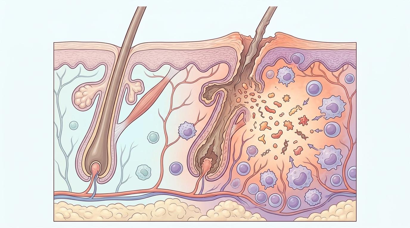 你可能听说过「免疫特权」——身体里有些部位,比如眼睛、生殖腺,还有生长期的毛囊,会刻意降低免疫识别信号,避免被免疫系统误伤。但毛囊坏死就像打破了一个装满「自身秘密」的潘多拉魔盒:细胞碎片里的蛋白质、核酸会变成「损伤相关分子模式」(DAMPs),相当于在皮肤里拉响了「有外敌入侵」的警报。