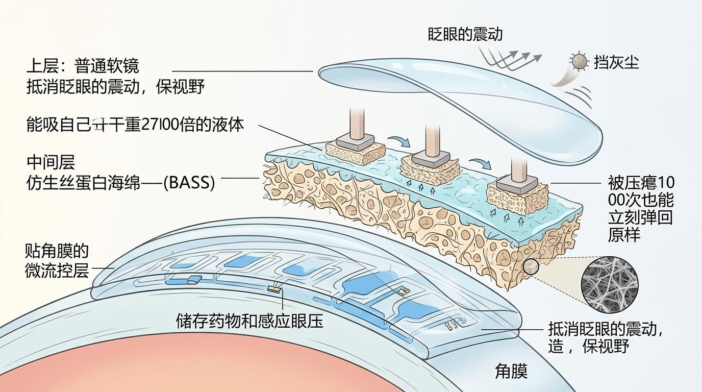 这款叫AP-TSCL的镜片是个「三明治」:下层是贴角膜的微流控层,刻着储存药物和感应眼压的细微通道;中间层是核心——仿生丝蛋白海绵(BASS),能吸自己干重2700倍的液体,还像弹力球一样,被压瘪100次也能立刻弹回原样,彻底解决了旧镜片一压就塌的毛病;上层是普通软镜,负责挡灰尘、保视野,还能抵消眨眼的震动。