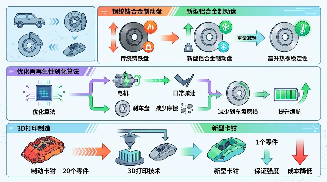 比如有的车企用新型铝合金制动盘替代传统铸铁盘,重量减轻40%的同时,热稳定性反而更高;有的企业优化再生制动算法,让电机承担更多日常减速任务,既减少刹车盘磨损,又提升续航;还有的供应商用3D打印技术制造制动卡钳,在保证强度的前提下,把零件数量从20个减到1个,成本直接降低30%。