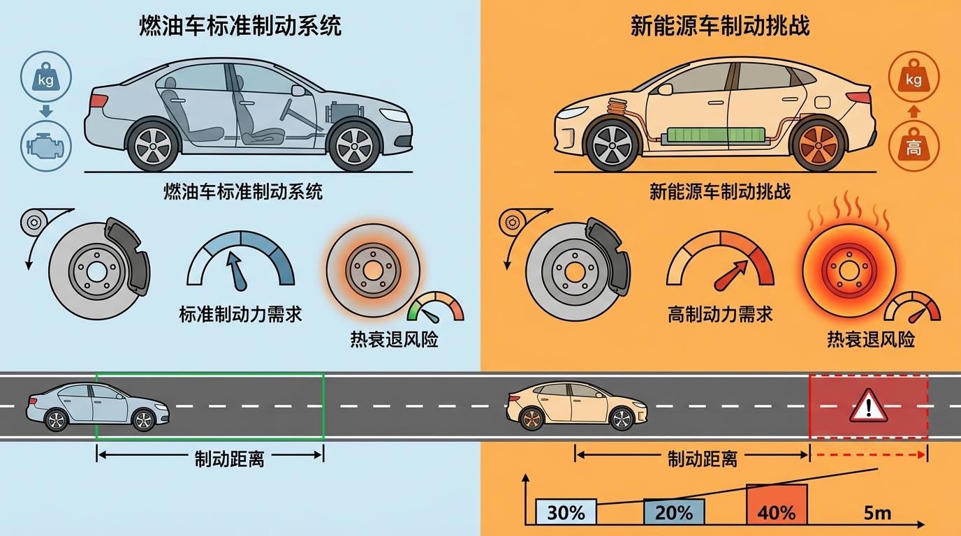 一组数据更能说明问题:新能源汽车的车重普遍比同级别燃油车重30%以上,紧急制动时的制动力需求高出20%,但变薄的刹车盘,热衰退风险比标准盘高出40%。在高速行驶中,这意味着刹车距离可能凭空多出5米——这5米,就是生死线。