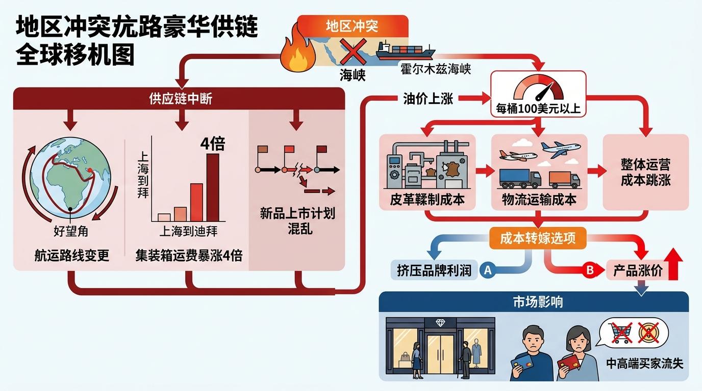 更棘手的是,这场冲突戳破了奢侈品行业的另一个隐形泡沫:看似全球化的产业链,实则脆弱得像串在霍尔木兹海峡上的珍珠。航运公司开始绕行好望角,上海到迪拜的集装箱运费暴涨4倍,原本精准到天的新品上市计划被打乱;油价突破每桶100美元,从皮革鞣制到物流运输的每一环成本都在跳涨。这些成本不会凭空消失,要么挤压品牌利润,要么通过涨价转嫁给消费者——而后者,正在把越来越多的中高端买家挡在门外。