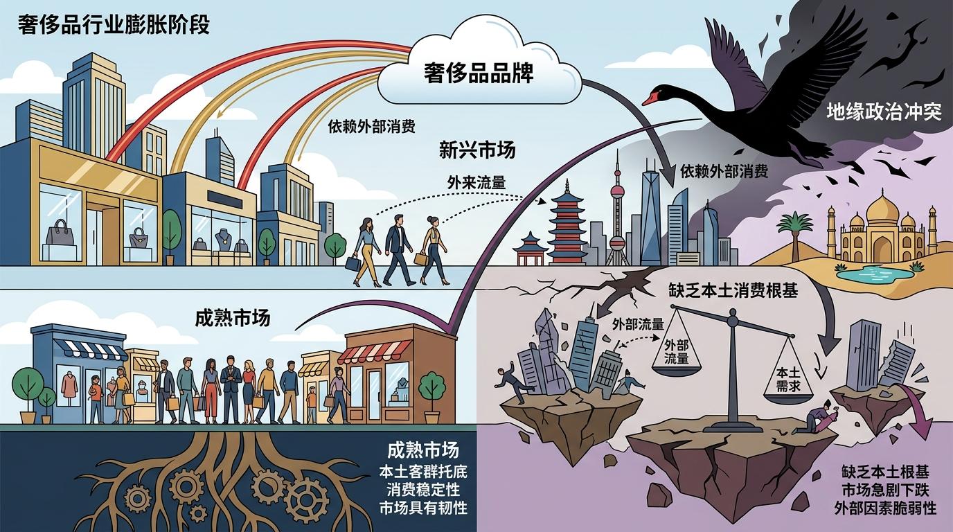 我认为,这场冲突真正的意义,是给奢侈品行业上了一堂「风险补课」。过去几年,品牌们忙着在中国、中东等新兴市场跑马圈地,却忽略了这些市场的共同软肋:依赖外部流量,缺乏本土消费的根基。当地缘政治的黑天鹅飞来,没有本土客群托底的市场,只会比成熟市场跌得更狠。