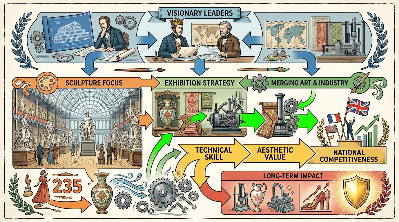 阿尔伯特亲王和亨利·科尔等组织者,正是带着“补品味”的目的策划了这场展览。他们特意开辟了雕塑展区——235件维多利亚时代雕塑,是当时规模最大的艺术展;还把装饰品、纺织品与机械展品并置,试图传递“艺术与工业结合”的信号。这场展览没有停留在“炫技”,而是第一次把工业产品的美学价值,提升到了国家竞争力的层面。
