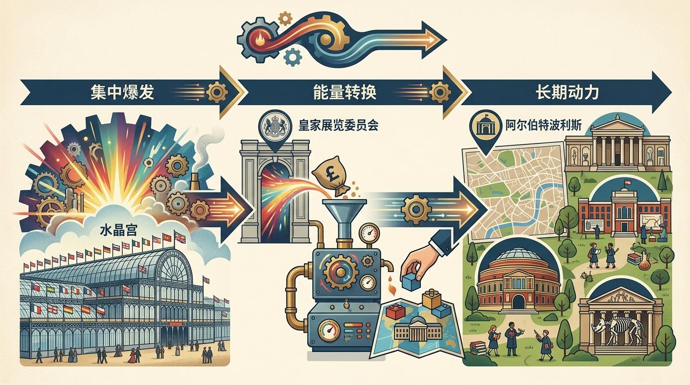 如果说博览会是一次集中爆发,那么1850年成立的皇家展览委员会,就是把爆发的能量转化为长期动力的“转换器”。这个以阿尔伯特亲王为主席的机构,不仅用190天建成了“水晶宫”,更在博览会结束后,用18.6万英镑盈余买下了伦敦南肯辛顿的87英亩土地——这里后来变成了“阿尔伯特波利斯”文化教育区。