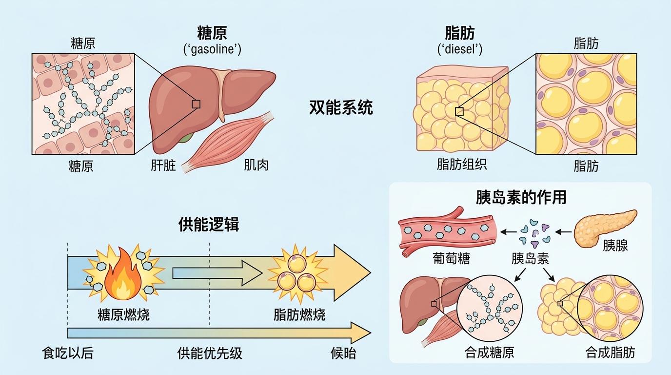 要搞懂空腹运动的「燃脂假象」,得先拆解身体的供能逻辑——你可以把它想象成一个双燃料汽车:糖原是随时能启动的汽油,脂肪是储备的柴油。正常进食后,胰岛素会把多余的能量打包成糖原和脂肪存起来,这时身体优先烧汽油。
