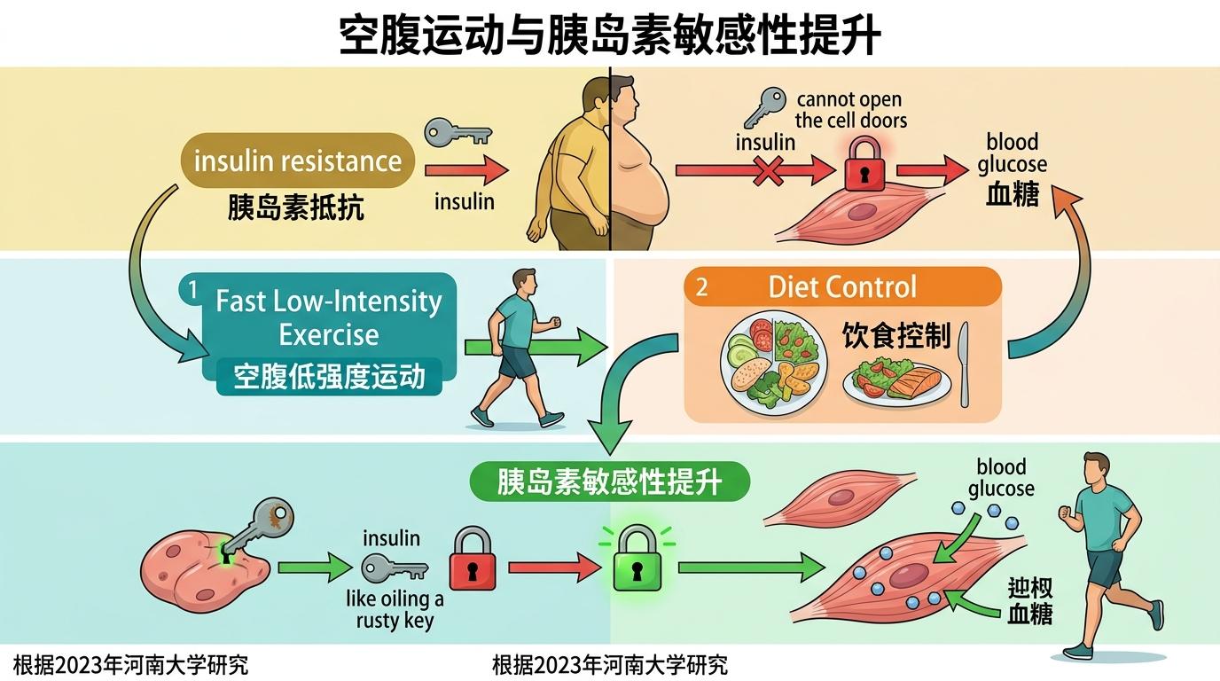 对于久坐不动、有胰岛素抵抗的人来说,空腹低强度运动能提高肌肉对胰岛素的敏感性——就像给生锈的钥匙上了油,让血糖能顺利进入细胞被利用。2023年河南大学的研究显示,空腹运动结合饮食控制,能让肥胖男性的胰岛素敏感性提升更明显。