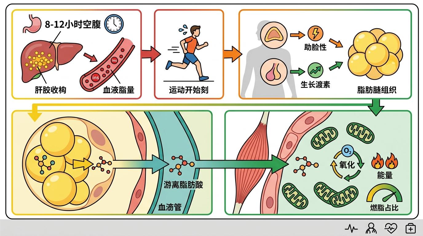 而经过8到12小时的空腹,肝脏里的糖原已经用掉了大半,胰岛素水平降到低点。这时候运动,身体会立刻切换模式:肾上腺素和生长激素开始动员脂肪细胞,把储存的三酰甘油拆成游离脂肪酸——也就是把柴油抽出来,泵去肌肉的线粒体里燃烧,这就是脂肪氧化(fat oxidation),也是手环上「燃脂占比」飙升的原因。