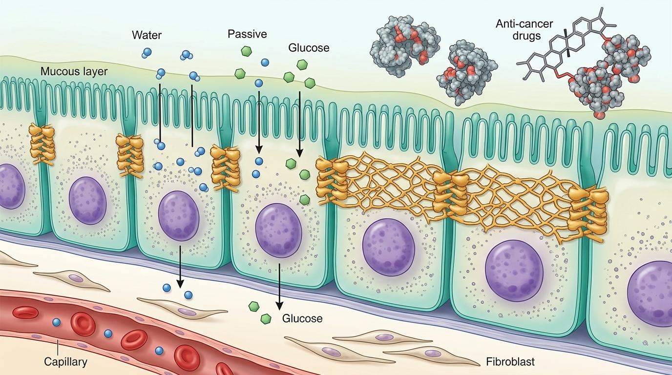 你可以把肠道上皮屏障想象成一排手拉手站成墙的士兵——每个肠上皮细胞就是一个士兵,细胞间的紧密连接就是他们握在一起的手,这层“人墙”只允许水、葡萄糖这种小分子“合法通行”,像抗癌药这种“大块头”根本挤不进去。