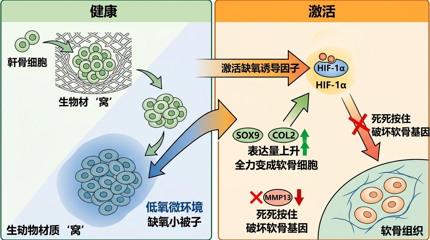 干细胞住进这个窝后,会自动聚成团,形成和天然软骨类似的低氧微环境——就像给细胞盖上了一层“缺氧小被子”。这种环境会激活缺氧诱导因子HIF-1α,就像给干细胞下达了“全力变成软骨细胞”的指令:SOX9、COL2这些软骨核心基因的表达量大幅上升,而会破坏软骨的MMP13则被死死按住。