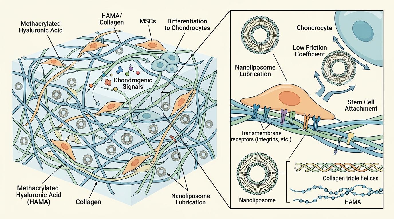 这个窝的骨架用了甲基丙烯酸化透明质酸和胶原,和天然软骨的“建材”几乎一模一样,能让干细胞牢牢“粘”在上面,还能传递“要变成软骨”的化学信号。更巧妙的是,研究人员在水凝胶里埋了纳米脂质体——就像给关节铺上了一层“仿生润滑油”,能把摩擦系数降到0.028,和天然软骨的0.002-0.03几乎持平,让新生的软骨不用刚长出来就被磨坏。