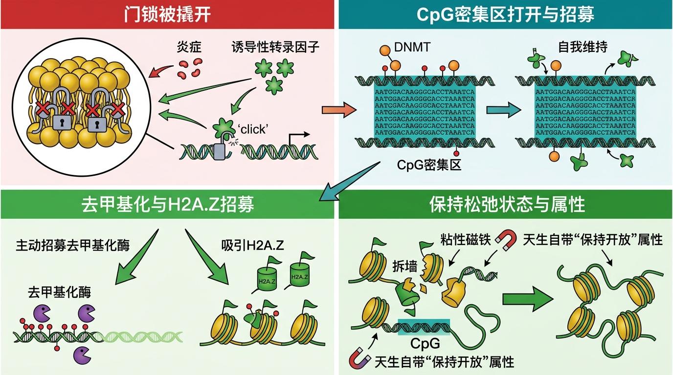 你可以把CpG密集区想象成一块“粘性磁铁”:炎症发生时,诱导性转录因子会先撬开染色质的“门锁”,而CpG密集区一旦被打开,就会启动一套自我维持的机制——它会主动招募DNA去甲基化酶,把原本抑制基因的甲基基团去掉;同时吸引一种叫H2A.Z的组蛋白变体,这种变体就像个“拆墙工”,能破坏核小体的稳定结构,让染色质保持松弛状态。更妙的是,CpG序列本身就不太容易和核小体结合,相当于天生自带“保持开放”的属性。