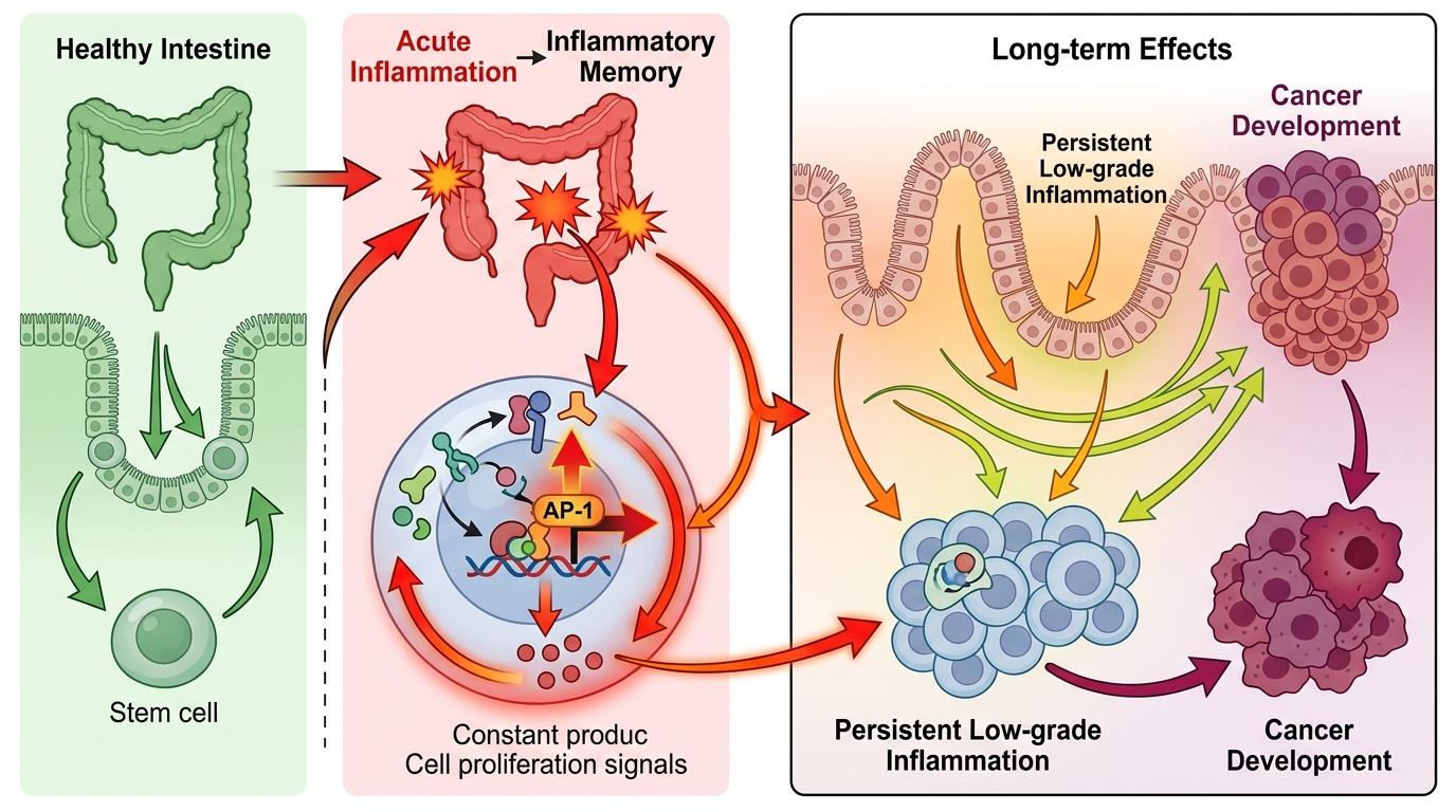 原因就在于,炎症记忆会让细胞一直处于“过度警觉”的状态。在肠道干细胞里,炎症留下的记忆表现为AP-1转录因子的活性持续增强,这种因子就像一个“信号放大器”,会不断激活促炎和促增殖的基因。哪怕炎症已经消失,干细胞还是会一直分泌促炎因子,让肠道微环境始终处于轻度炎症状态——而这种长期的低级别炎症,正是癌症的温床。
