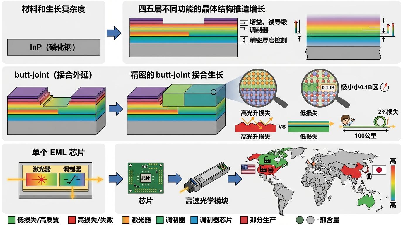 但这颗小芯片的制造难度,是普通激光芯片的3倍以上。它得用InP(磷化铟)材料做基底,要在几微米的空间里精准长出四五层不同功能的晶体结构,还要用butt-joint(接合外延)技术把激光器和调制器无缝粘在一起,光损耗控制在0.1dB以内——相当于光跑100公里,能量只损失2%。这种精度要求,让全球能批量生产高端EML芯片的厂商不超过5家,全被美日企业垄断。