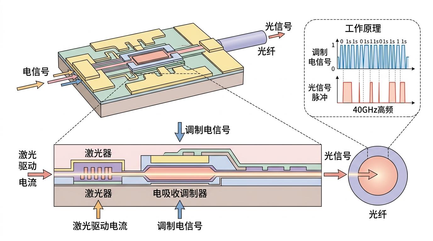 你可以把EML芯片理解为高速光通信的“信号发射器”——它要把电信号转换成能在光纤里跑的光信号,而且得跑够远、够快,不能“掉链子”。和普通激光芯片比,它相当于把“手电筒”和“调光开关”做在了一起:激光器负责发光,电吸收调制器负责把数据编码进光里,这种集成设计能让光信号以40GHz以上的频率高速切换,还能减少信号失真,刚好匹配AI数据中心、5G回传这些长距离高速传输的需求。