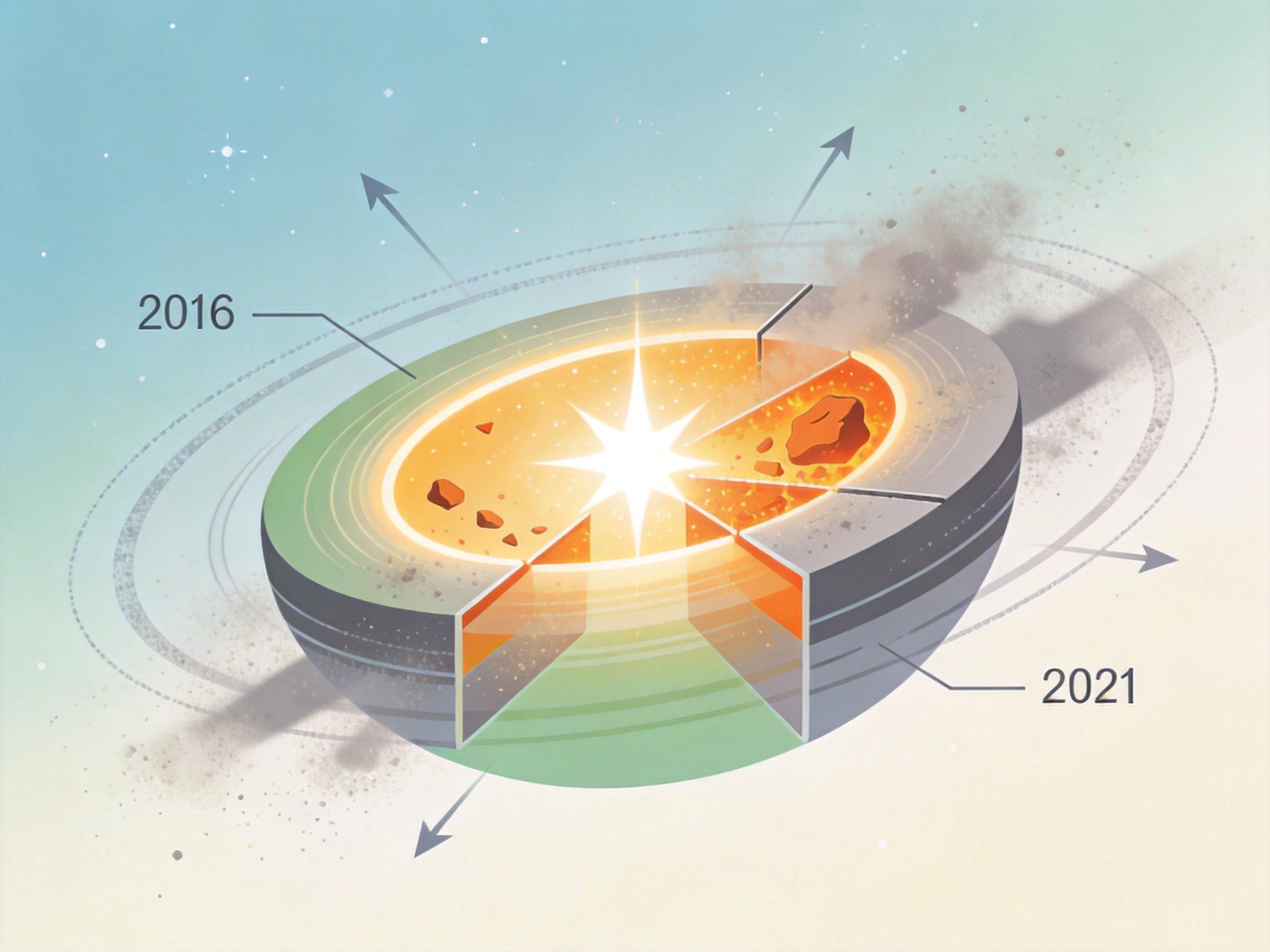 你可以把这次观测想象成:在1.1万光年外的邻居家,透过窗户看见客厅里的灯忽明忽暗,凑过去才发现,是两个花瓶撞碎后,碎渣在灯光前转来转去。 Gaia20ehk的亮度波动,正是两颗行星碰撞后产生的尘埃云在“挡光”。2016年的三次规律性变暗,是两颗行星在碰撞前的多次擦碰,每次都溅起少量碎片;2021年开始的混乱波动,则是最终的致命撞击——两颗行星正面相撞,撞出的岩石和尘埃被加热到900开尔文(约627℃),在恒星周围形成了直径超过0.13天文单位的炽热尘埃盘,质量相当于整个土卫二。