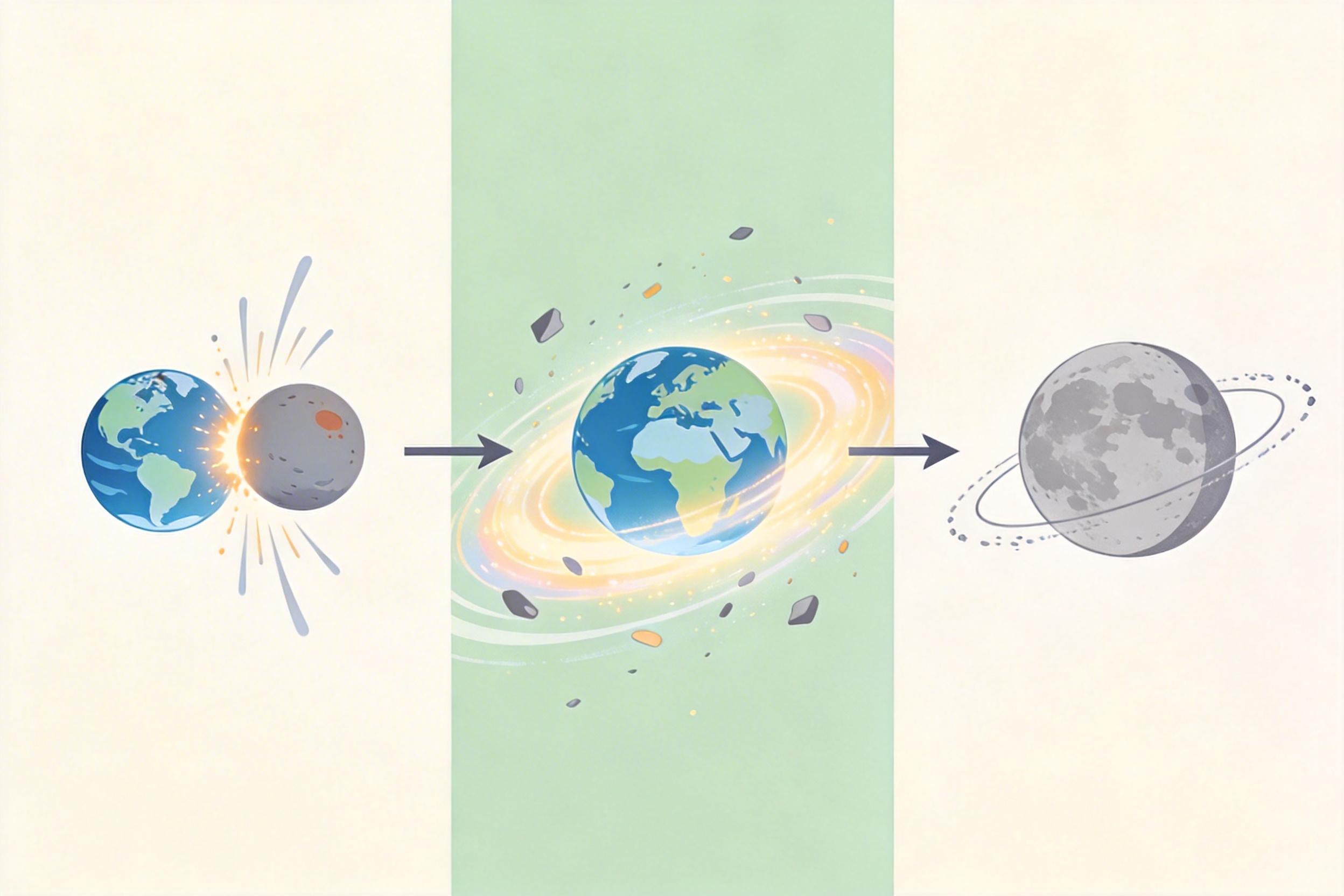 我们之所以对这场遥远的撞击如此兴奋,是因为它几乎就是45亿年前地球“撞月事件”的翻版。 目前月球起源的主流“巨撞假说”认为,年轻的地球被一颗火星大小的原行星“忒伊亚”撞击,撞飞的碎片在地球周围形成尘埃盘,最终聚合成月球。但这个假说一直缺了最关键的一环:没人见过真实的“撞月现场”,只能靠地月岩石的同位素匹配、月球的小铁核等间接证据反推。
