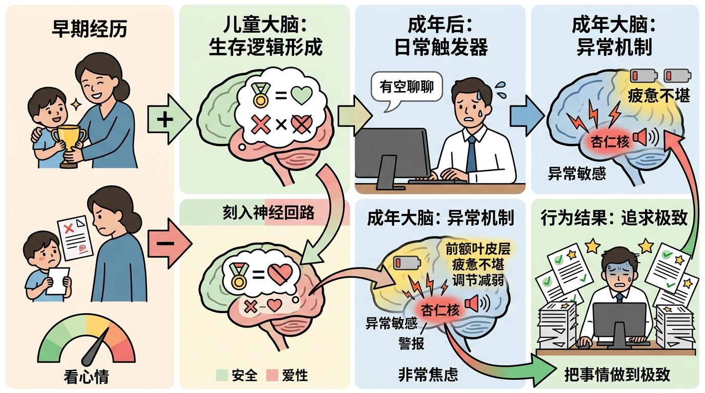 依恋理论里,早年如果照顾者的回应总是“看心情”——比如考第一就被抱,考砸了就被冷着,孩子的大脑会形成一套生存逻辑:“只有我表现好,才值得被爱,才是安全的。”这套逻辑会刻进神经回路:负责情绪预警的杏仁核变得异常敏感,哪怕是同事一句平淡的“有空聊聊”,它都会触发“是不是我做错事了”的警报;而本该负责理性调节的前额叶皮层,会被反复的焦虑耗得疲惫不堪,只能靠“把事情做到极致”来暂时安抚杏仁核。