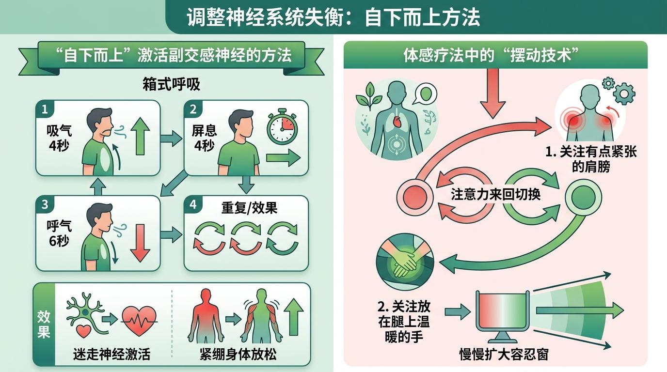 最基础的是先调整神经系统的失衡——用“自下而上”的方法激活副交感神经:比如每天花5分钟做“箱式呼吸”,吸气4秒、屏息4秒、呼气6秒,让迷走神经帮你把紧绷的身体松下来;体感疗法里的“摆动技术”也有用:试着把注意力在“有点紧张的肩膀”和“放在腿上温暖的手”之间来回切换,慢慢扩大你的容忍窗。