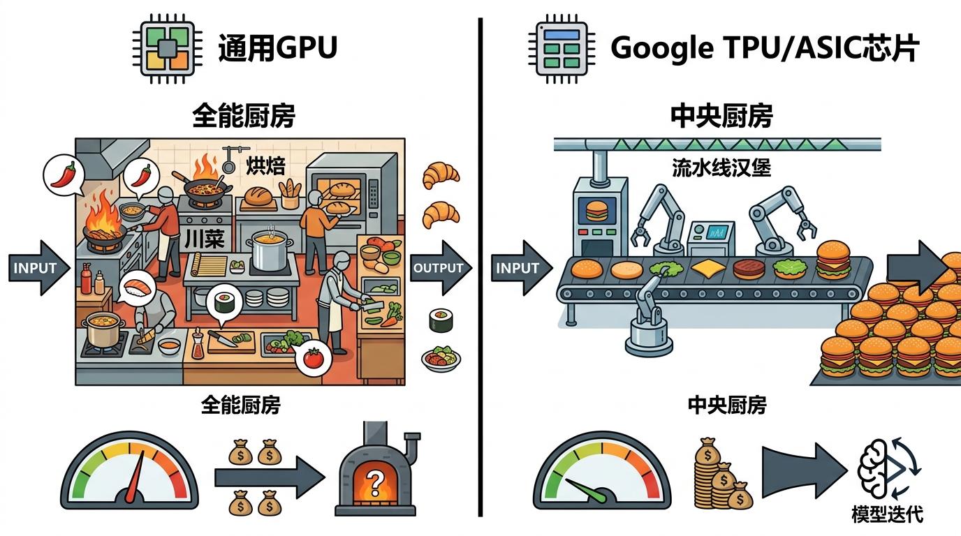 要理解这步棋的狠处,得先搞懂定制芯片和通用GPU的区别:如果说GPU是能炒川菜也能做烘焙的全能厨房,那Google TPU这种定制ASIC芯片,就是只做流水线汉堡的中央厨房——它砍掉了所有多余功能,把矩阵乘法这种AI最常用的计算,优化到每瓦性能是GPU的3到5倍。对年营收300亿的Anthropic来说,这意味着每算10亿次token,能省下近40%的电费和硬件成本,而这些钱,又能砸回模型迭代,拉开和竞争对手的差距。