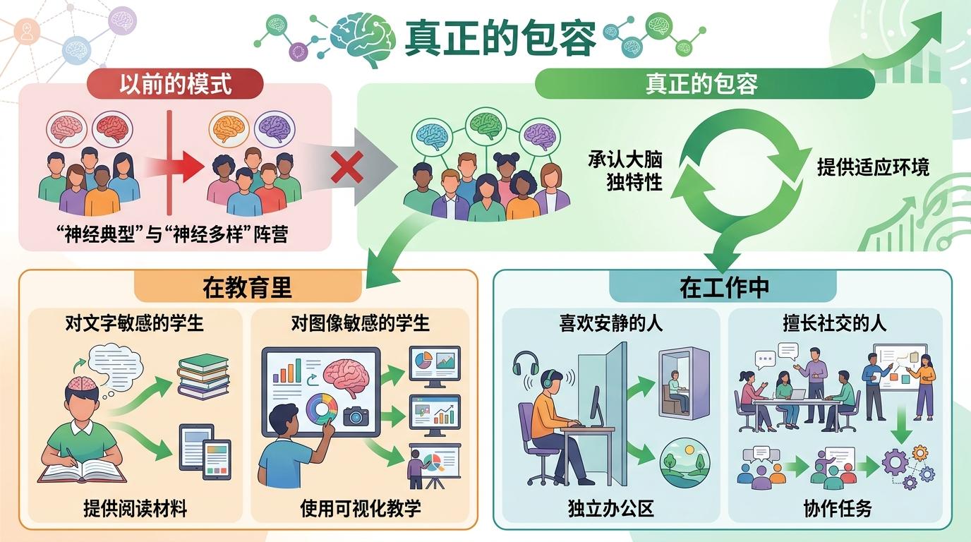 真正的包容,不是把人分成“神经典型”和“神经多样”两大阵营,而是承认每个人的大脑都是独特的,并且为这种独特性提供适应的环境。比如在教育里,给对文字敏感的学生多提供阅读材料,给对图像敏感的学生多使用可视化教学;在工作中,允许喜欢安静的人选择独立办公区,给擅长社交的人多安排协作任务。