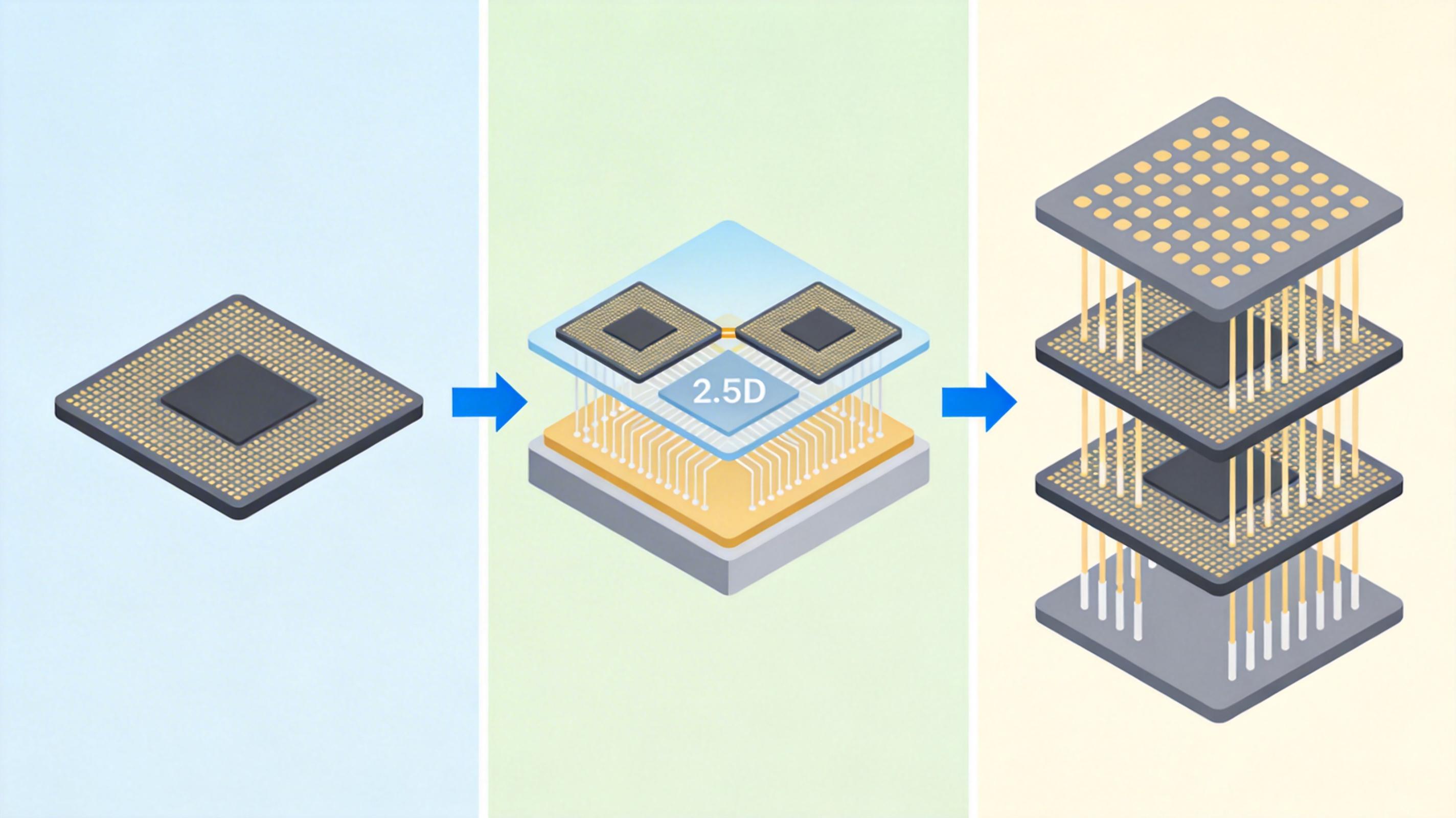 先进封装则是给芯片做了一套“定制化手术”:2.5D封装用硅中介层当“高速站台”,让芯片们在同一平面上通过纳米级的线路直接对话;3D封装更激进,把芯片像叠积木一样垂直堆起来,用贯穿硅片的通孔当“电梯”,数据传输距离从厘米级缩短到微米级。