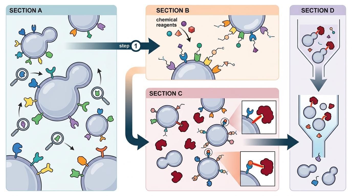 这个平台把酵母表面展示和化学选择性修饰结合起来:先让酵母在表面展示不同的蛋白变体,每个酵母都是一个'面试者';再用化学试剂去修饰这些蛋白,给它们装上不同的化学弹头;最后把靶点蛋白加进去,看哪个酵母表面的蛋白能最快和靶点形成共价键。