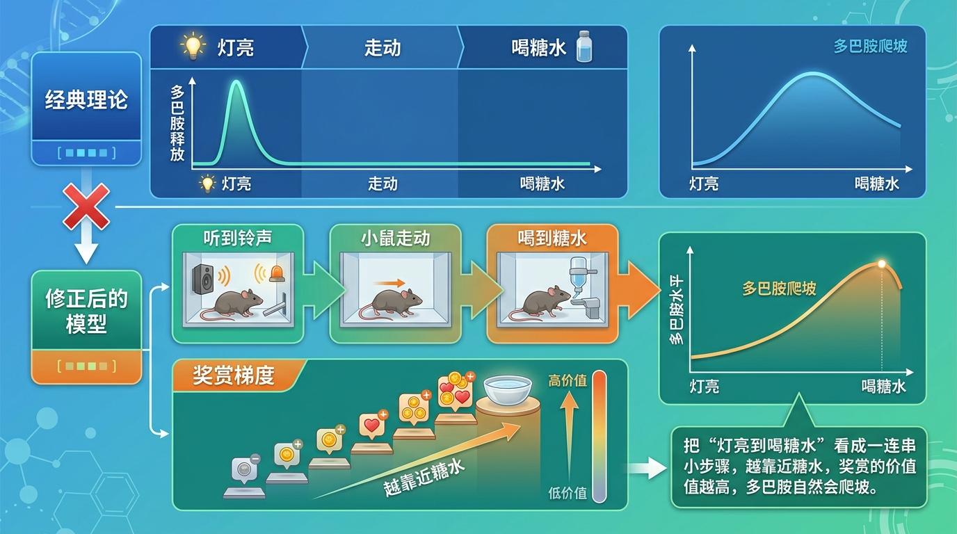 最颠覆的一击来自加州大学旧金山分校的南布迪里。他给完全没受过训练的小鼠随机喂糖水,按照经典理论,小鼠知道糖水随机出现后,多巴胺反应会下降;但实验结果恰恰相反,多巴胺释放越来越高。他提出了一个完全反向的理论:大脑的学习不是“先看到线索,再等奖赏”,而是“先得到奖赏,再回头找是什么带来了它”——多巴胺不是提前预测,而是事后回溯。