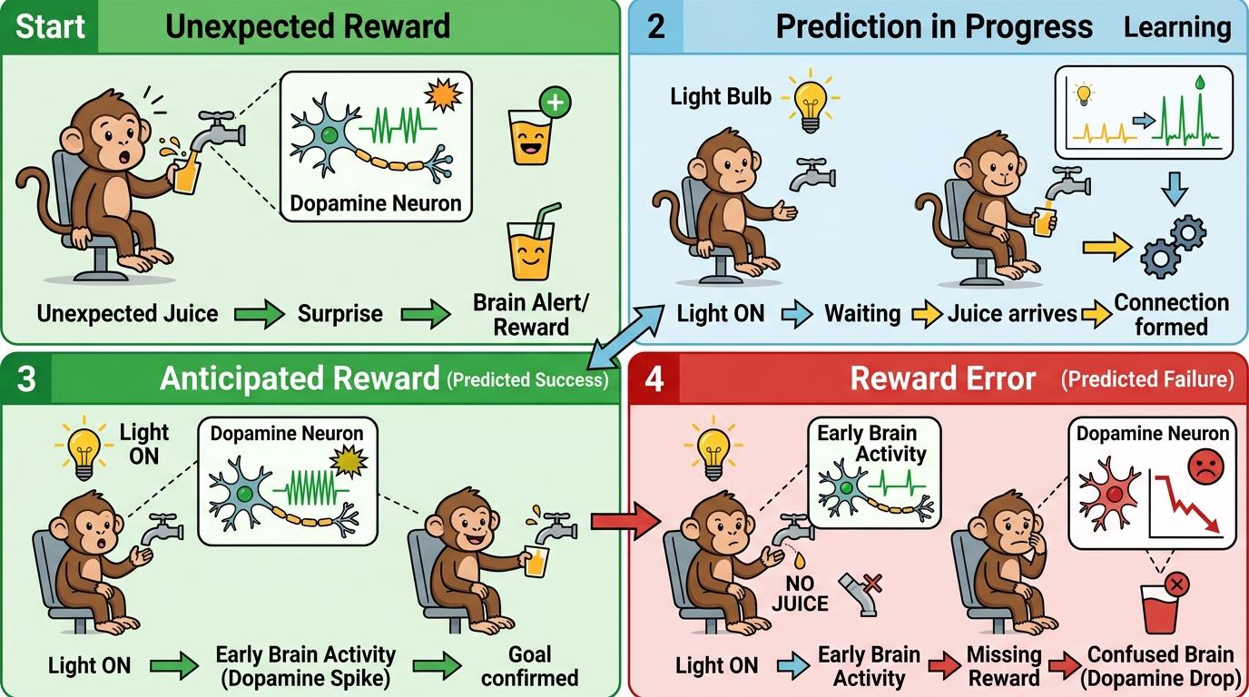 1997年的猴子实验,是这一切的起点。科学家给猴子喂果汁,意外发现:当果汁毫无预兆出现时,猴子大脑里的多巴胺神经元会疯狂放电;反复几次后,只要喂果汁前先开一盏灯,多巴胺的释放会提前到灯亮的瞬间——大脑学会了把灯光和“即将有甜水喝”绑定;如果灯亮了却没果汁,多巴胺会骤降,像一个记分员突然划掉了本该得的分。