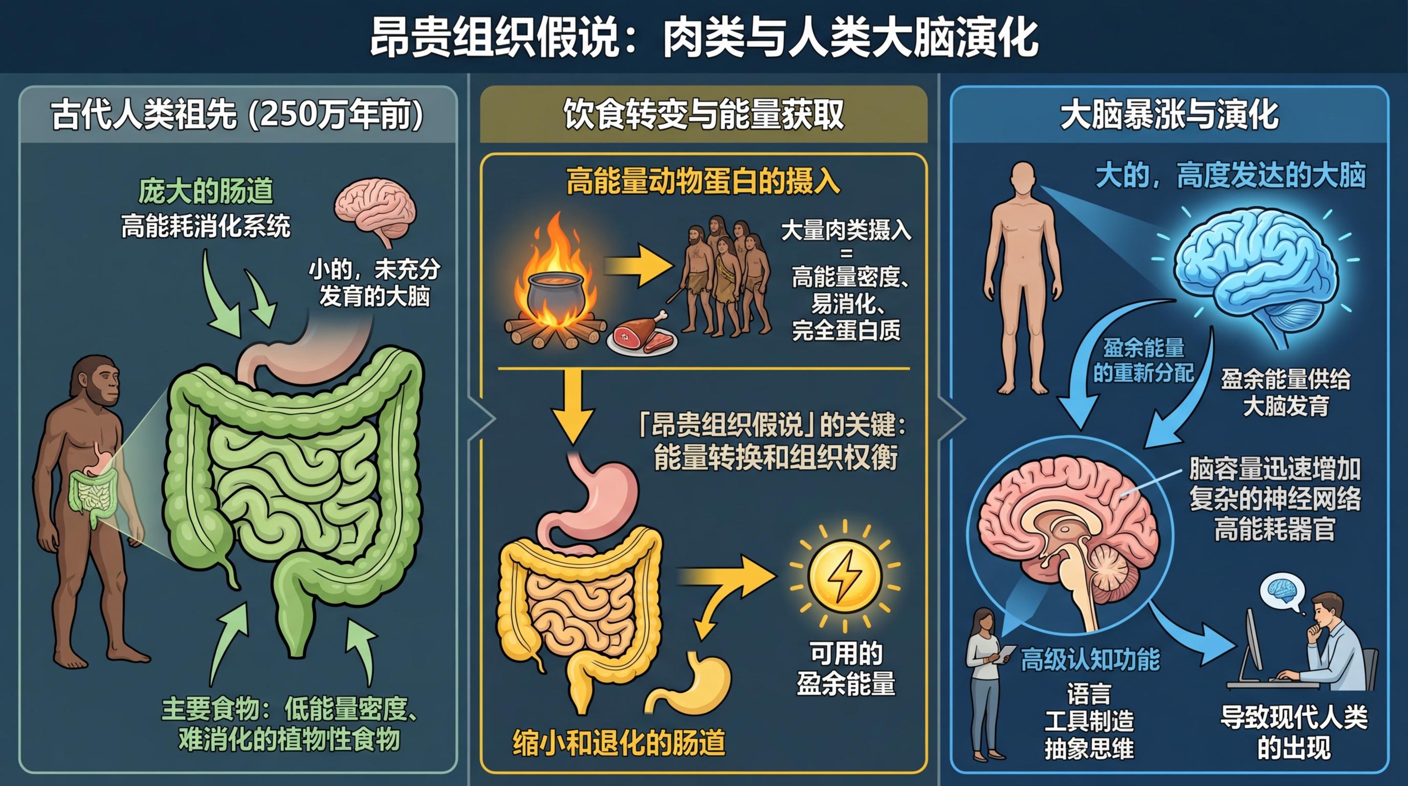 我们对肉类的执念,不是后天养成的习惯,而是刻在进化里的本能。250万年前,人类祖先开始大量摄入肉类,高能量的动物蛋白支撑了大脑的飞速发育——这就是「昂贵组织假说」:缩小耗能的肠道,用省下来的能量供养暴涨的大脑,而肉类正是这种能量转换的关键载体。