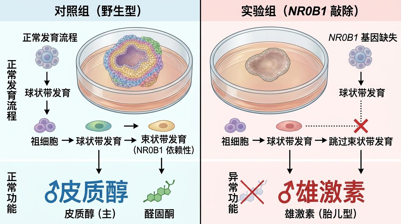 有意思的是,当他们敲除了调控发育的NR0B1基因后,类器官直接跳过了束状带的发育,变成了只分泌雄激素的胎儿型肾上腺——这完美解释了X连锁肾上腺发育不全的致病机制。以前这种病的病因只能靠基因测序推测,现在在培养皿里就能亲眼看到疾病的发生过程。