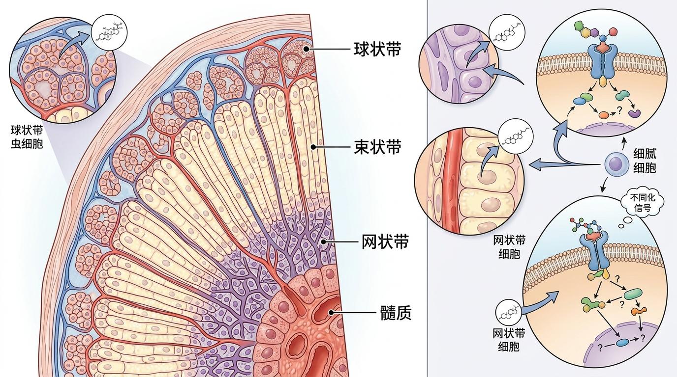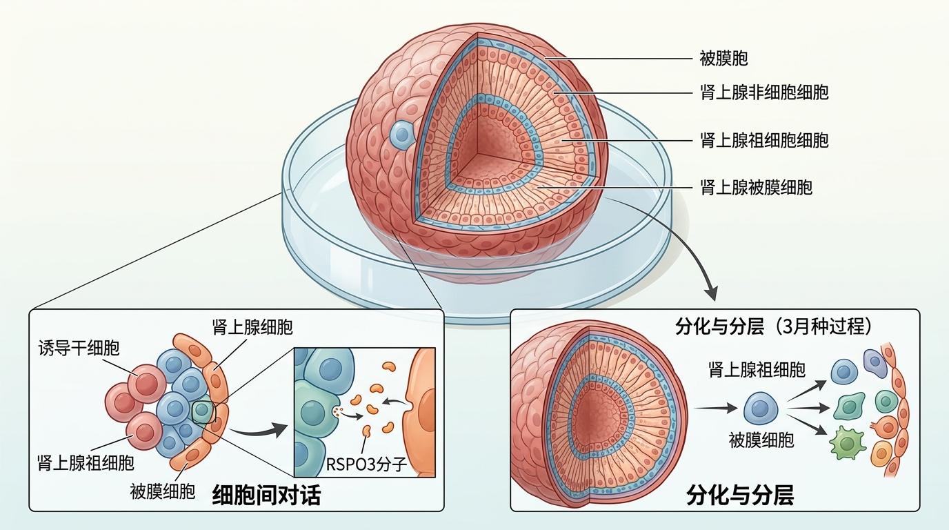 肾上腺皮质像个分层的蛋糕:外层球状带管血压,中层束状带分泌皮质醇,内层网状带管性激素。每一层的细胞都有自己的「信号密码」,要在培养皿里复刻这种结构,难在让干细胞「听懂」发育指令。